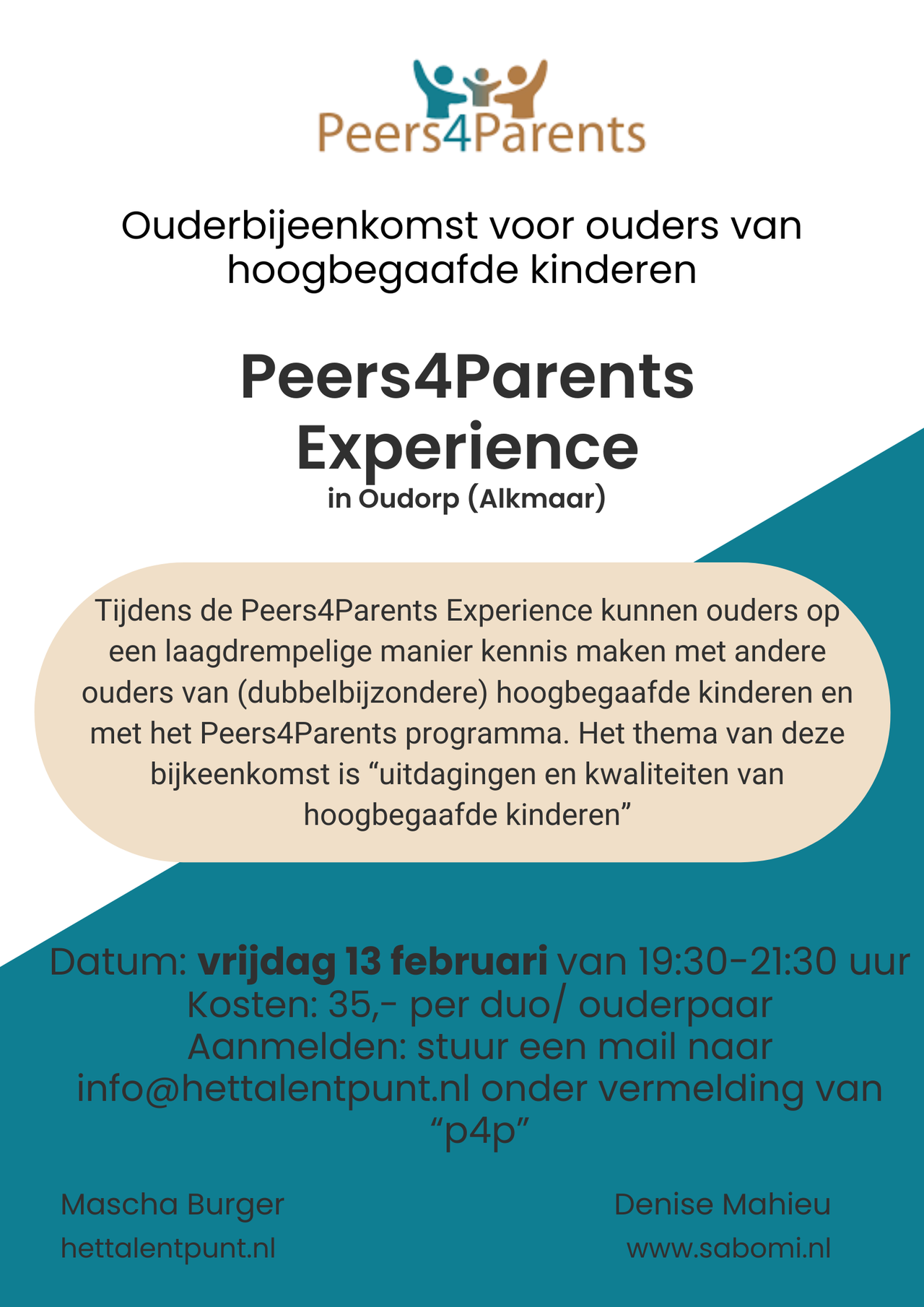 Ouderbijeenkomst voor ouders van (dubbelbijzondere) hoogbegaafde kinderen. Tijdens de Peers4Parents Experience kunnen de ouders op een laagdrempelige manier kennismaken met elkaar en met het Peers4Parents Programma.