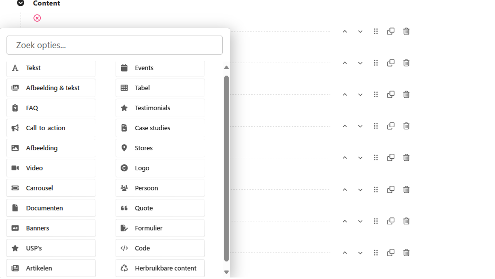 Hier zie je op welke manieren je jouw profiel (store) kunt vullen met de volgende opties voor content elementen